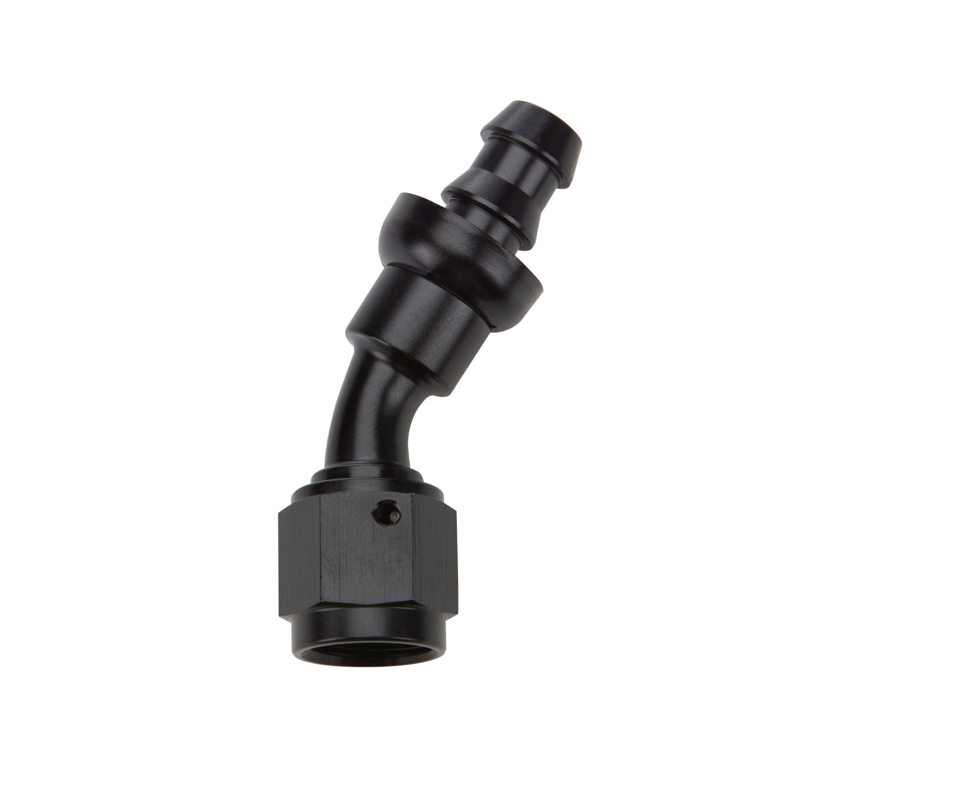 Fitting - Hose End - 30 Degree - 6 AN Hose Barb to 6 AN Female - Aluminum - Black Anodized - Each